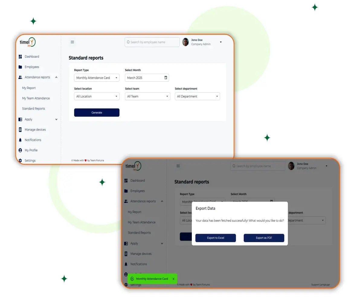 Since timely.bio uses biometric authentication (face recognition), this advanced attendance machine prevents employees from clocking in for each other, effectively eliminating buddy punching and time fraud. As a secure facial recognition attendance system, it ensures only authorized personnel can mark their attendance.